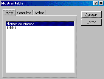 Aparecerá el cuadro de diálogo Mostrar tabla de la derecha esperando indicarle las tablas que formarán parte de la relación a crear. Seleccionar una de las tablas que pertenecen a la relación haciendo clic sobre ella, aparecerá dicha tabla remarcada. Hacer clic sobre el botón Agregar. Repetir los dos pasos anteriores hasta añadir todas las tablas de las relaciones a crear. Hacer clic sobre el botón Cerrar.