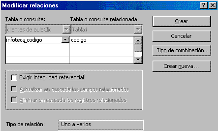 En la parte superior deben estar los nombres de las dos tablas relacionadas (clientes de infoteca y tabla1) y debajo de éstos el nombre de los campos de relación (infoteca_codigo y codigo). Ojo! siempre deben ser campos que contengan el mismo tipo de información y por lo tanto del mismo tipo. Observa en la parte inferior el Tipo de relación que se asignará dependiendo de las características de los campos de relación (en nuestro caso uno a varios). Activar el recuadro Exigir integridad referencial haciendo clic sobre éste. Si se desea, se puede activar las casillas Actualizar en cascada los campos relacionados y Eliminar en cascada los registros relacionados. Para terminar, hacer clic sobre el botón Crear. Se creará la relación y ésta aparecerá en la ventana Relaciones.