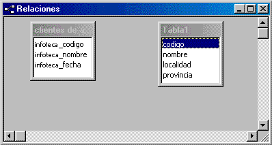 Para crear la relación: Ir sobre el campo de relación de la tabla principal (en nuestro caso infoteca_codigo). Pulsar el botón izquierdo del ratón y manteniéndolo pulsado arrastrar hasta el campo codigo de la tabla secundaria (Tabla1). Soltar el botón del ratón. |