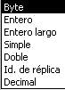 Byte (equivalente a un carácter) para almacenar valores enteros entre 0 y 255. Entero para valores enteros comprendidos entre -32.768 y 32.767. Entero largo para valores enteros comprendidos entre -2.147.483.648 y 2.147.483.647. Simple para la introducción de valores comprendidos entre -3,402823E38 y -1,401298E-45 para valores negativos, y entre 1,401298E-45 y 3,402823E38 para valores positivos. Doble para valores comprendidos entre -1,79769313486231E308 y -4,94065645841247E-324 para valores negativos, y entre 1,79769313486231E308 y 4,94065645841247E-324 para valores positivos. Id. de réplica se utiliza para claves autonuméricas en bases réplicas. Decimal para almacenar valores comprendidos entre -10^38-1 y 10^38-1 (si estamos en una base de datos .adp) y números entre -10^28-1 y 10^28-1 (si estamos en una base de datos .mdb)