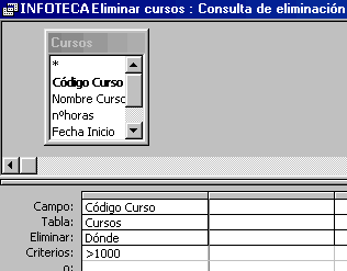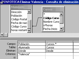Con esta consulta eliminamos los cursos (Desde la tabla Cursos) que tengan alumnos de Valencia (Dónde Población = "Valencia"). Cuando el origen es una sola tabla la columna Desde no es necesaria. Si NO se indica un criterio de búsqueda, se borran TODOS los registros de la tabla.