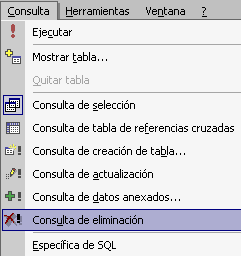 Las consultas de eliminación son consultas que eliminan de una tabla los registros que cumplen el criterio de búsqueda especificado. Para crear una consulta de actualización: Abrimos una nueva consulta en vista diseño. Añadimos la tabla de la que queremos borrar los registros. Desplegamos el menú