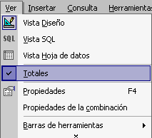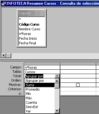 añade una fila a la cuadrícula QBE, la fila Total: Los valores que podemos indicar en la fila Total: son los que aparecen al desplegar la lista asociada a la celda como puedes ver en la imagen de la derecha: