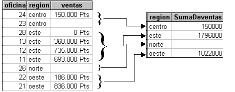 mientras que la segunda consulta es una consulta resumen, cada fila del