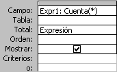 Para que cuente en número de registros hay que utilizar la función Cuenta(*) devuelve el número de filas por lo tanto contará también los valores nulos. En este caso tenemos que seleccionar la opción Expresión y escribirlo así: