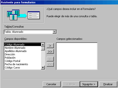 En esta ventana nos pide introducir los campos a incluir en el formulario. Primero seleccionamos la tabla o consulta de donde cogerá los datos del cuadro Tablas/Consultas, este será el origen del formulario. Si queremos sacar datos de varias tablas lo mejor será crear una consulta para obtener esos datos y luego elegir como origen del formulario esa consulta. A continuación