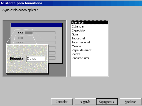 Siguiente y aparece la siguiente pantalla: En esta pantalla elegimos el estilo que queremos dar al formulario, podemos elegir entre los estilos que tiene definidos Access. Seleccionando un estilo aparece en el dibujo de la izquierda el aspecto que tendrá el formulario con ese estilo. Una vez seleccionado el estilo que nos interesa pulsamos el botón Siguiente y aparece la última pantalla del asistente para formularios: |