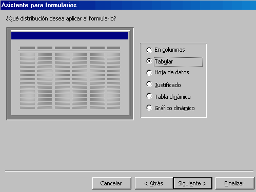 En esta pantalla elegimos la distribución de los datos dentro del formulario. Seleccionando un formato aparece en el dibujo de la izquierda el aspecto que tendrá el formulario con esa distribución.