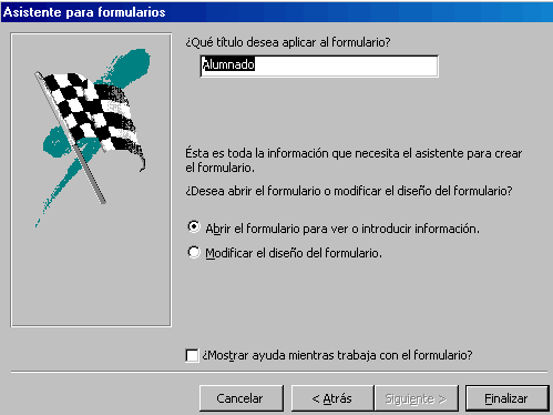 En esta ventana el asistente nos pregunta el título del formulario, este título también será el nombre asignado al formulario. Antes de pulsar el botón Finalizar podemos elegir entre: