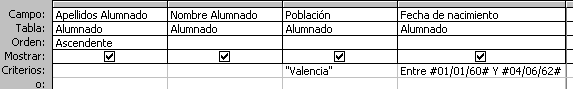 Para seleccionar filas tenemos que indicar un criterio de búsqueda, un criterio de búsqueda es una condición que deberán cumplir todas las filas que aparezcan en el resultado de la consulta. Normalmente la condición estará basada en un campo de la tabla por ejemplo para seleccionar los alumnos de Valencia la condición sería población = "Valencia". Para escribir esta condición en la cuadrícula tenemos que tener en una de las columnas de la cuadrícula el campo poblacion y en esa columna ponemos en la fila Criterios: el resto de la condición o sea ="Valencia". Cuando la condición es una igualdad no es necesario poner el signo =, podemos poner directamente el valor Valencia en la fila Criterios: ya que si no ponemos operador asume por defecto el =. Tampoco es necesario poner las comillas, las añadirá él por defecto. Siempre que se encuentra un texto lo encierra entre comillas. Si en la fila Criterios: queremos poner un nombre de campo en vez de un valor (para comparar dos campos entre sí) tenemos que encerrar el nombre del campo entre corchetes [ ]. Por ejemplo queremos poner la condición precio = coste en la que precio y coste son dos campos, tenemos que poner en la fila criterios: [coste], si no ponemos los corchetes añadirá las comillas y entenderá Precio = "coste", precio igual al valor Coste no al contenido del campo Coste. Para indicar varias condiciones se emplean los operadores Y y O. En un criterio de búsqueda en el que las condiciones están unidas por el operador Y, para que el registro aparezca se deben cumplir todas las condiciones. Por ejemplo precio > 100 y precio < 1200, aparecen los registros cuyo precio está comprendido entre 101 y 1199. En un criterio de búsqueda en el que las condiciones están unidas por el operador O, el registro aparecerá en el resultado de la consulta si cumple al menos una de las condiciones. Todas las condiciones establecidas en la misma fila de la cuadrícula quedan unidas por el operador Y. En el ejemplo siguiente serían alumnos de Valencia Y cuya fecha de nacimiento esté comprendida entre el 1/1/60 y el 31/12/69.