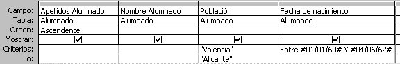 Visualizaremos de la tabla Alumnado los campos Apellidos, Nombre, Población y Fecha nacimiento, los alumnos aparecerán ordenados por Apellidos pero únicamente aparecerán aquellos que sean de Valencia y hayan nacido entre el 1/1/60 y el 31/12/69, o bien aquellos de Alicante sea cual sea su fecha de nacimiento. ¡Ojo! El criterio de la fecha de nacimiento únicamente afecta a la población Valencia por encontrarse en la misma fila. Access no diferencia entre mayúsculas y minúsculas a la hora de realizar la búsqueda de registros.