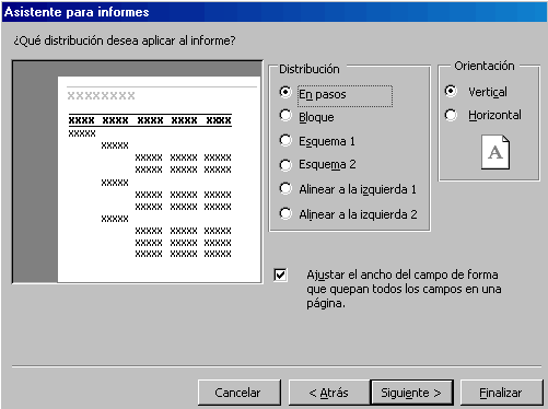 En esta pantalla elegimos la distribución de los datos dentro del informe. Seleccionando una distribución aparece en el dibujo de la izquierda el aspecto que tendrá el informe con esa distribución. En el cuadro Orientación podemos elegir entre impresión Vertical u Horizontal (apaisado). Con la opción Ajustar el ancho del campo de forma que quepan todos los campos en una página, se supone que el asistente generará los campos tal como lo dice la opción. A continuación pulsamos el botón Siguiente> y aparece la ventana siguiente: |