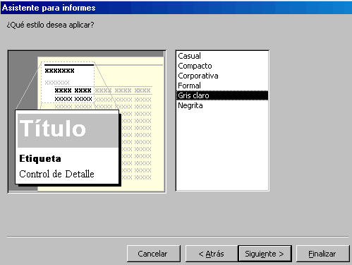 En esta pantalla elegimos el estilo que queremos dar al informe, podemos elegir entre los estilos que tiene definidos Access. Seleccionando un estilo aparece en el dibujo de la izquierda el aspecto que tendrá el informe con ese estilo. Una vez seleccionado el estilo que nos interesa pulsamos el botón Siguiente y aparece la última pantalla del asistente para informes: |
