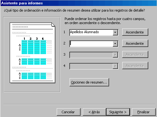 En esta pantalla podemos elegir ordenar los registros por hasta cuatro campos de ordenación. Seleccionamos el campo por el que queremos ordenar los registros que saldrán en el informe, y elegimos si queremos una ordenación ascendente o descendente, para elegir una ordenación descendente hacer clic sobre el botón Ascendente y pasará a ser Descendente. Podemos elegir un tipo de ordenación diferente en los distintos campos de ordenación. Esta pantalla nos