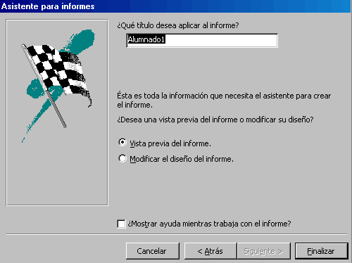 En esta ventana el asistente nos pregunta el título del informe, este título también será el nombre asignado al informe. Antes de pulsar el botón Finalizar podemos elegir entre: