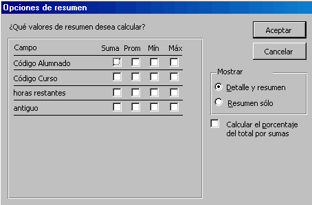 En el cuadro de diálogo aparece la lista de los campos numéricos que tenemos en el informe, y las funciones de agregado que se pueden seleccionar para calcular algún total. Para que en el informe aparezca la suma de algún campo sólo tenemos que seleccionar la casilla que se encuentra en la fila del campo y en la columna Suma. Podemos así elegir varios totales. En el cuadro Mostrar si activamos la opción Detalle y resumen, aparecerán en el informe tanto las líneas de detalle (los registros del origen) como las líneas de totales. Si activamos la opción Resumen sólo, no aparecerán las líneas de detalle. Si activamos la casilla Calcular el porcentaje del total por sumas añade un total el porcentaje que representa la suma calculada sobre la suma total de todos los registros. Por ejemplo si sumamos las horas por grupo el porcentaje sería el porcentaje que representan las horas del grupo sobre el total de horas de todos los grupos. Una vez rellenadas las opciones correspondientes hacemos clic en el botón Aceptar para volver a la ventana del asistente. Para seguir con el asistente hacemos clic sobre el botón Siguiente> y aparece la siguiente ventana: