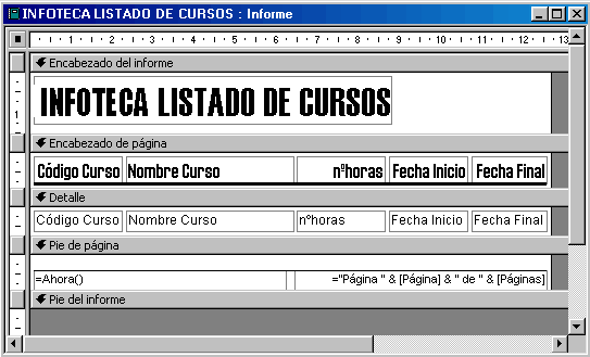 Si has entrado en diseño de informe y no aparece esta barra la puedes hacer aparecer desde el menú Ver, Barras de Herramientas, opción Diseño de informe. A continuación describiremos los distintos botones que pertenecen a esta barra.